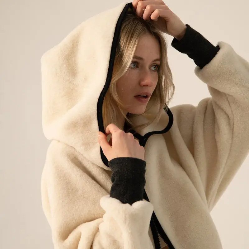 Wool brings a different kind of warmth compared to fleece. It insulates well without feeling overly bulky, and it can look more “elevated” or outerwear-like, especially in cleaner silhouettes. If you’re aiming for a refined hoodie that works like a light jacket, wool (or wool-blend) can create that premium feel fast.